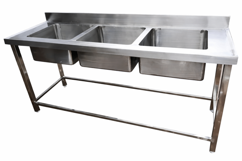 Commercial sinks and racks offer several benefits in professional kitchens such as hotels, restaurants, cafés, and catering units. They help maintain high hygiene standards by allowing proper washing, draining, and air-drying of utensils and food items. Made from stainless steel, they are durable, rust-resistant, and easy to clean, ensuring long-term use. Sinks improve kitchen efficiency by handling heavy workloads, while racks provide organized storage and save valuable floor space. Together, they enhance workflow, reduce clutter, and support compliance with food safety regulations.